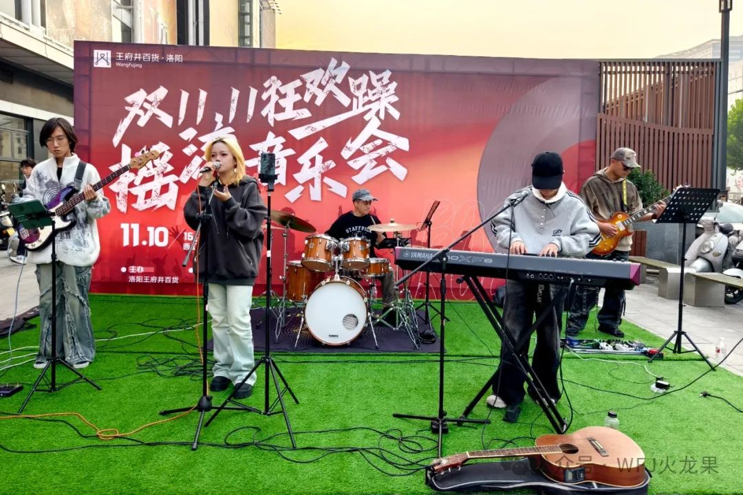洛阳店举行“双十一狂欢躁,,, ,,,,,摇滚音乐节”,,, ,,,,,在低折扣运动的基础上,,, ,,,,,带给消耗者新鲜的购物体验感。。。。。。。。五位乐队成员在草坪上恣意赞美,,, ,,,,,吸引众多途经的市民驻足围观。。。。。。。。店内安排一张超长购物清单,,, ,,,,,向主顾推荐各品类重点品牌超值商品信息,,, ,,,,,并附有门店微商城双十一专区二维码,,, ,,,,,让消耗者一目了然。。。。。。。。